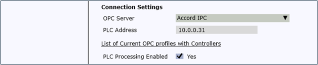 The PLC Processing Enabled allows Accord processing to be paused. This is sometimes useful when a full PLC Setup is being carried out. This setting is common, whether Accord IPC or an OPC Server is being used.